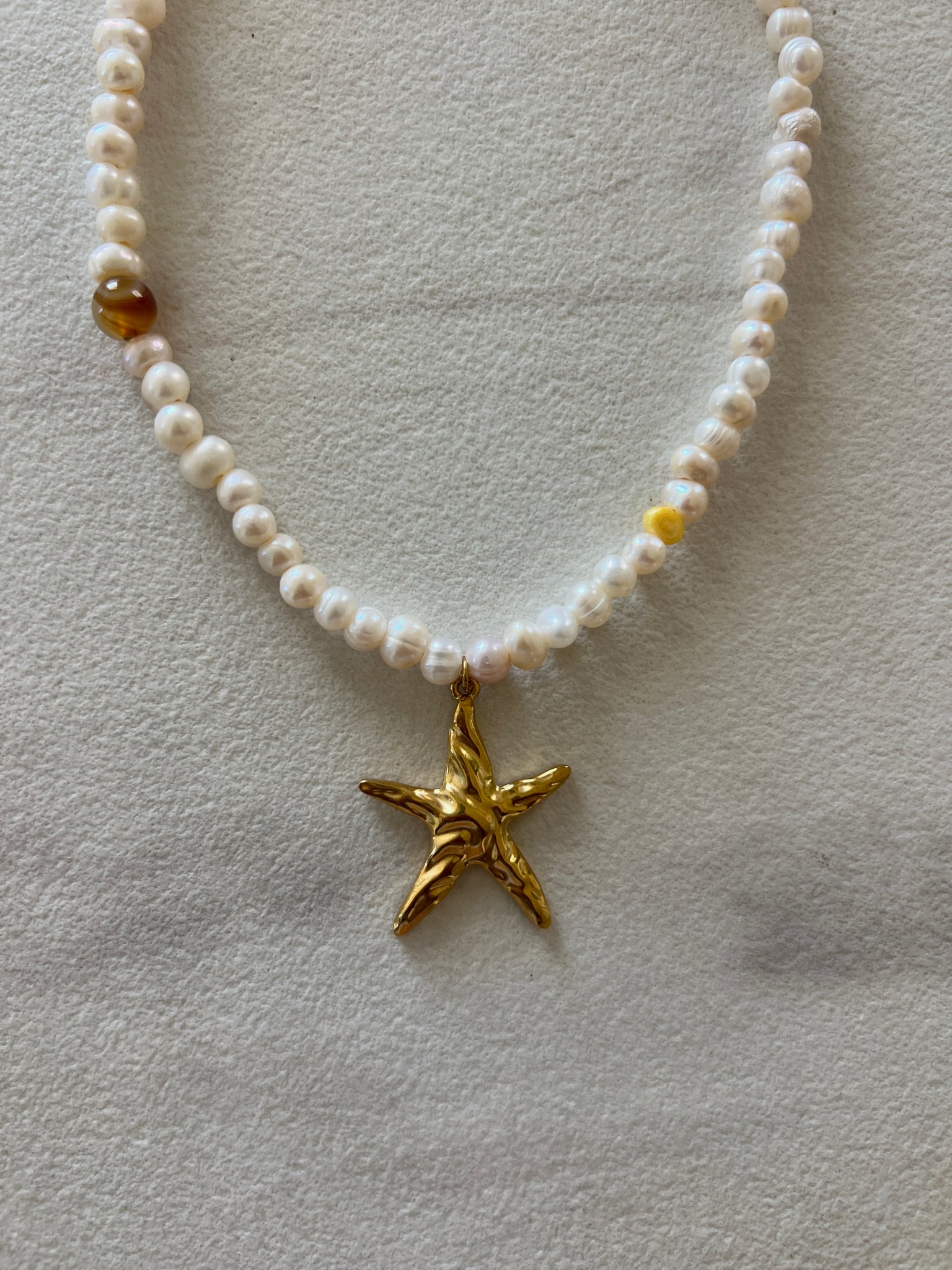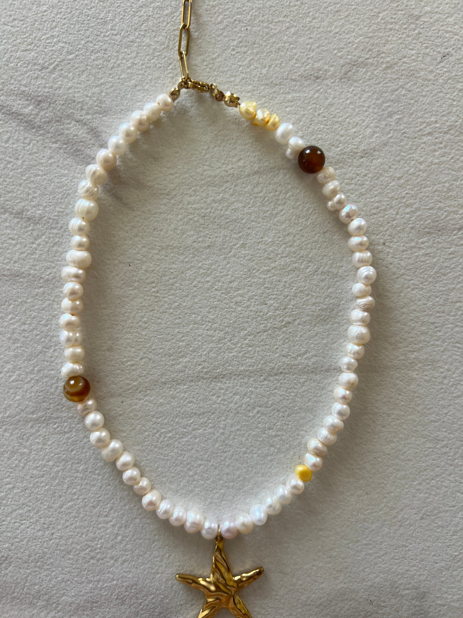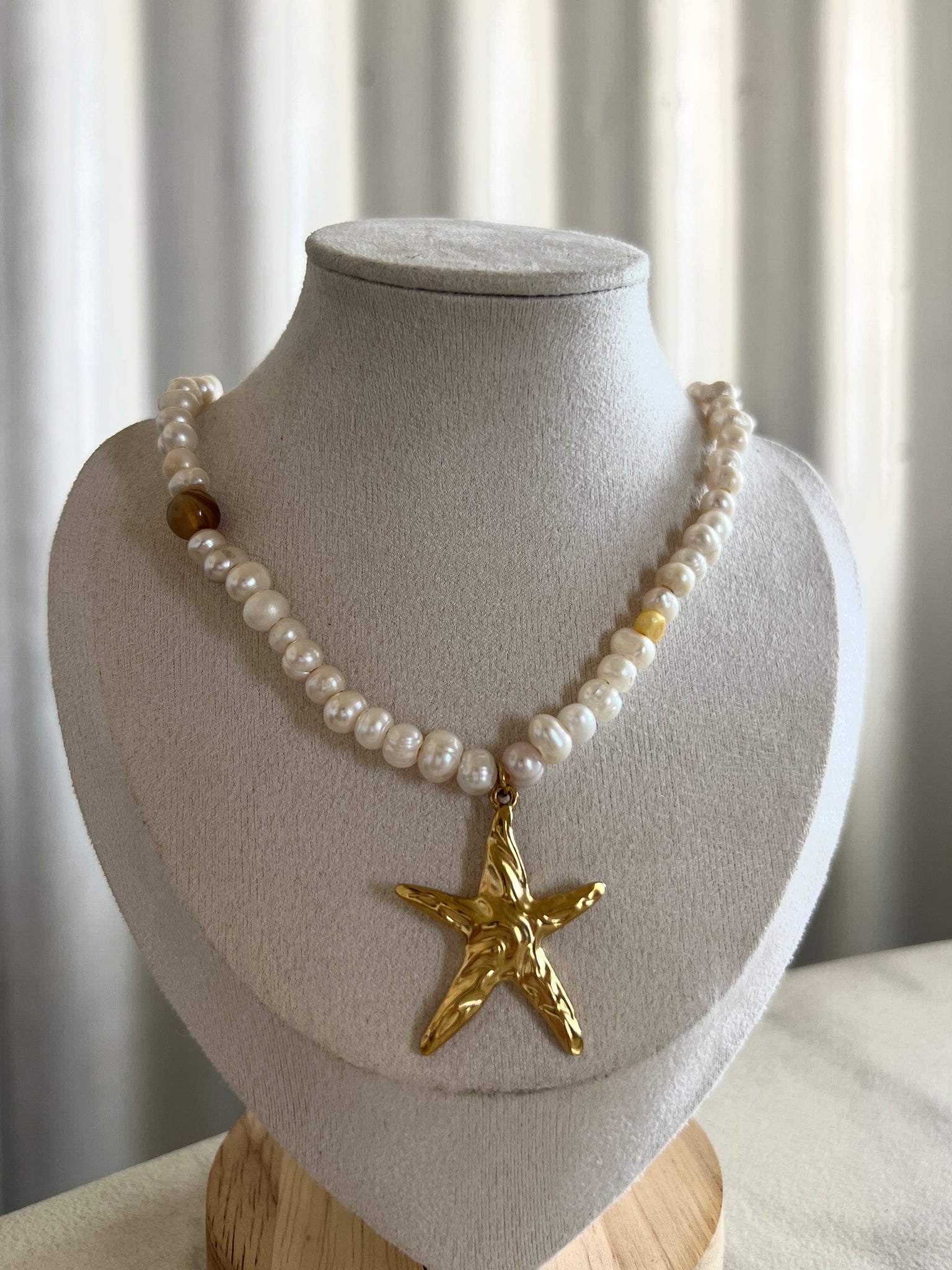 Este collar combina perlas de agua dulce con toques de color amarillo y cuentas de ojo de tigre. Tiene un dije de estrella dorada y detalles en acero inoxidable como el cierre, las terminaciones y el extensor de cadena.